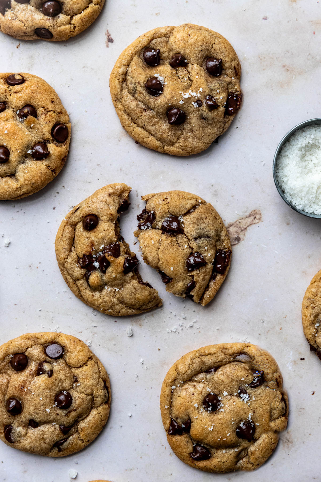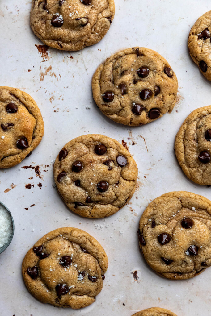 • Add a few chocolate chips on top of each cookie ball. Cook for 9-11 minutes. Remove from the oven and sprinkle with flaky sea salt. Let it cool down completely and enjoy!