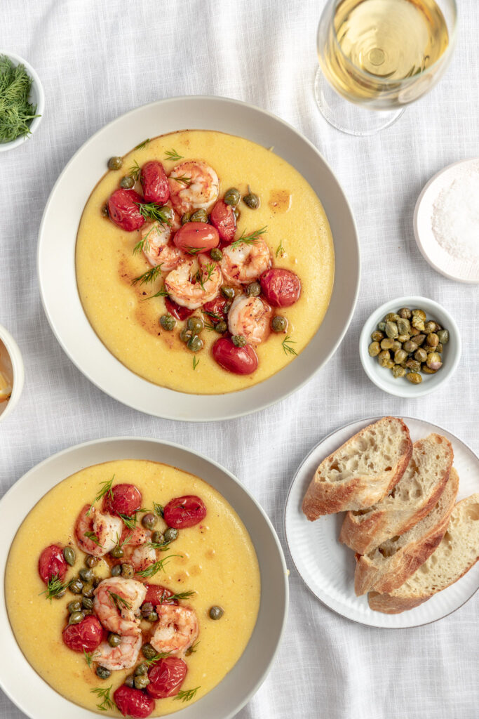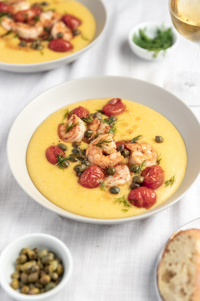 This creamy polenta with shrimp is the Saturday date night dinner you’ll want to make. Shrimp in a lemon capers sauce with grape tomatoes served over a creamy polenta, for a fancy dinner!