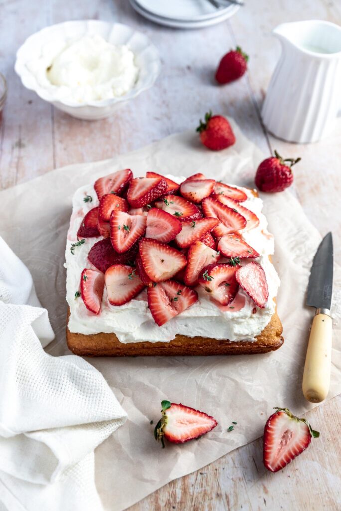 - Easy to make: you just have to bake the vanilla cake, prepare the mascarpone whipped cream and garnish with fresh strawberries.