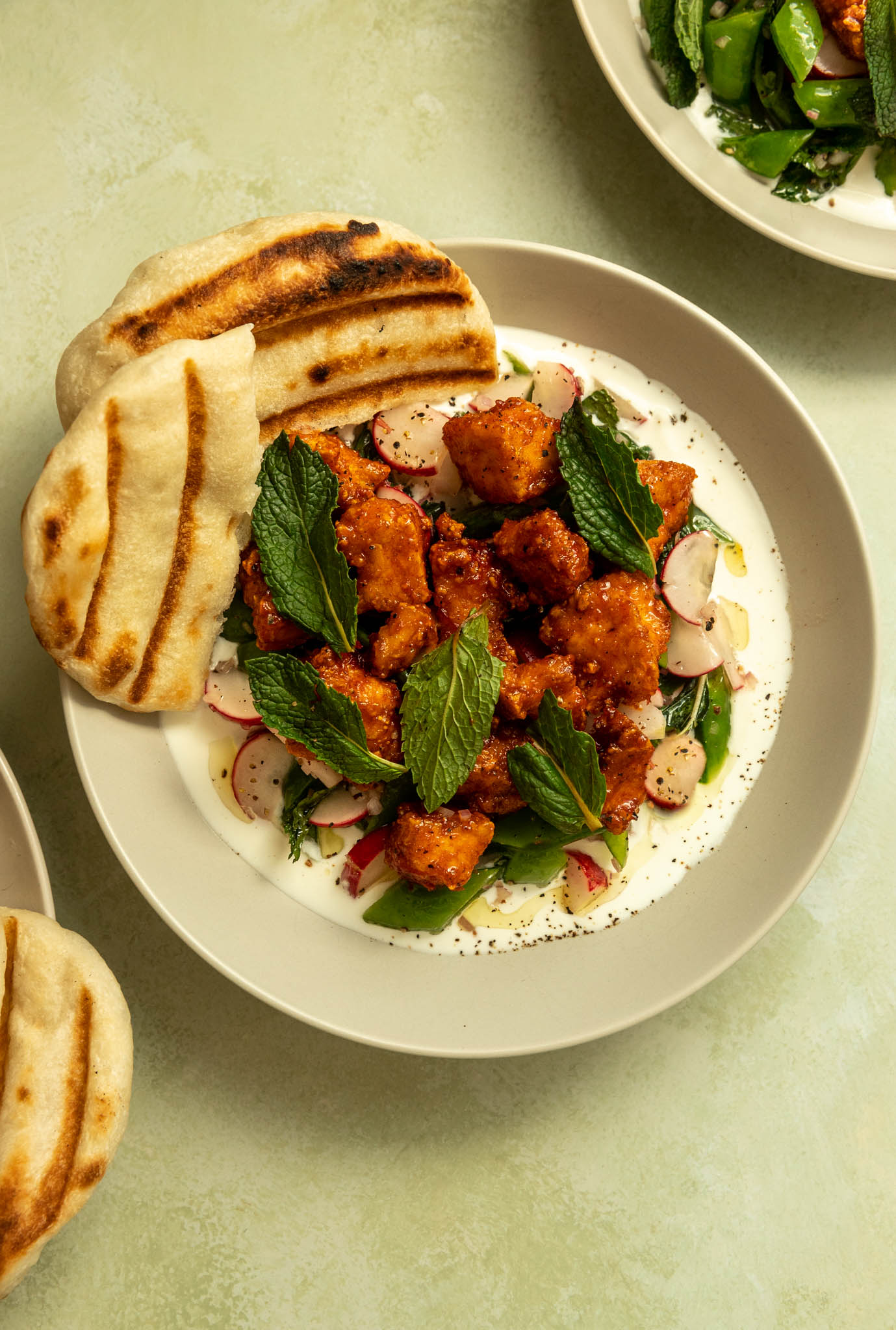 - To assemble, spoon a generous layer of whipped feta into the bottom of shallow bowls. Top with the crunchy salad and harissa tofu. Finish with a drizzle of olive oil, some freshly cracked pepper, and a few mint leaves. Serve with flatbread on the side for scooping.