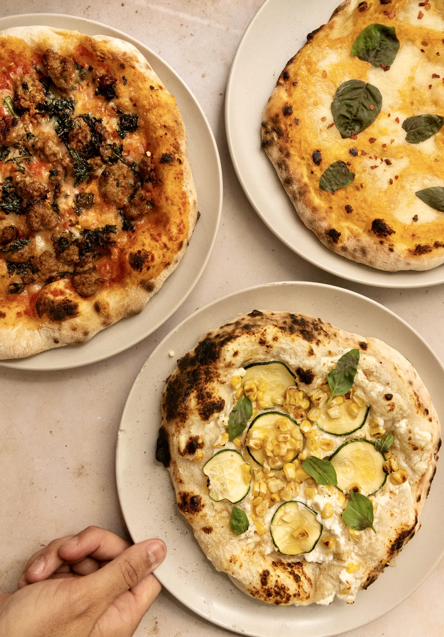 • Bake the pizza using your preferred method (see below), then finish with fresh basil leaves.