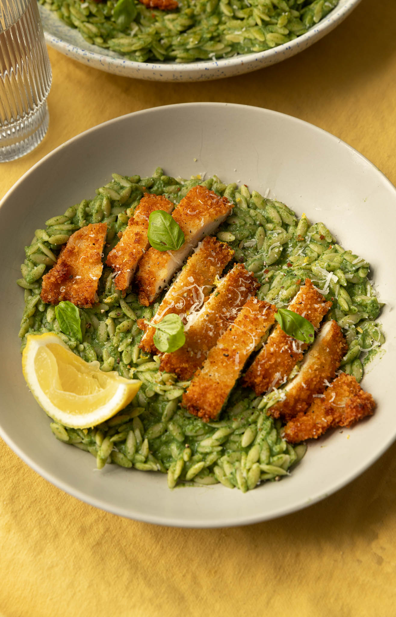 - Serve. Arrange the creamy spinach orzo on plates, add the sliced chicken on top, and sprinkle with grated Parmesan if desired. You can also serve the panko chicken with honey (or even hot honey) if you like it!