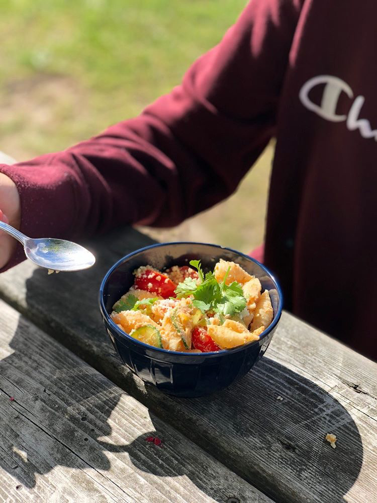 • Ajouter les pâtes, le maïs, les tomates, la coriandre et le fêta et bien mélanger. Au besoin, ajouter plus d’huile d’olive ou un peu d’eau en fonction de la consistance.