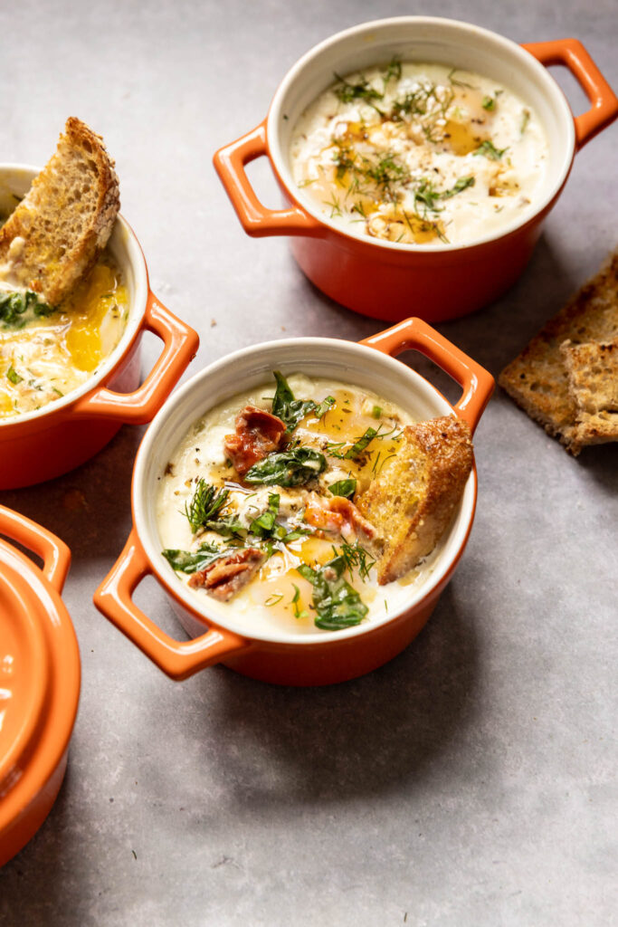 - Cook the spinach. In a pan on medium heat, sauté spinach with olive oil and garlic. Cook for about 3–4 minutes.