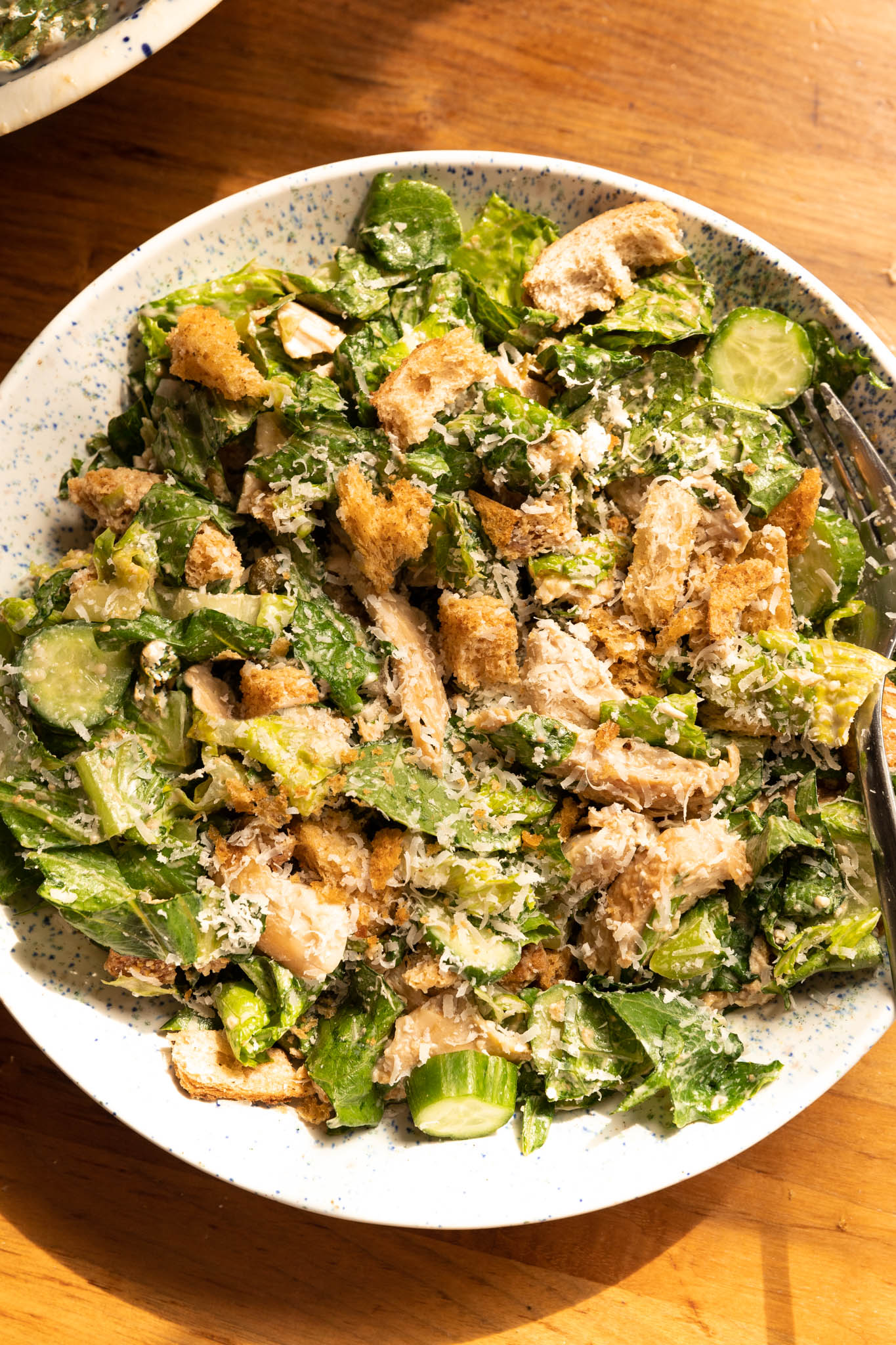 - Assemble. In a large bowl, place the sliced lettuce, sliced cucumbers, chicken pieces, capers, and homemade croutons. Pour the dressing over and toss well to coat.