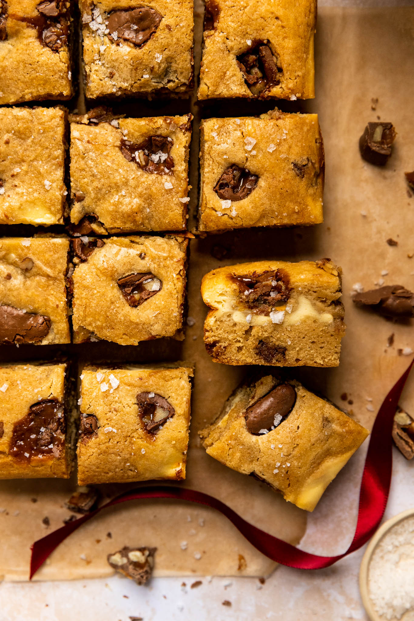 - Laisser refroidir complètement. Ajouter un peu de fleur de sel sur le dessus et trancher en 16 morceaux égaux.