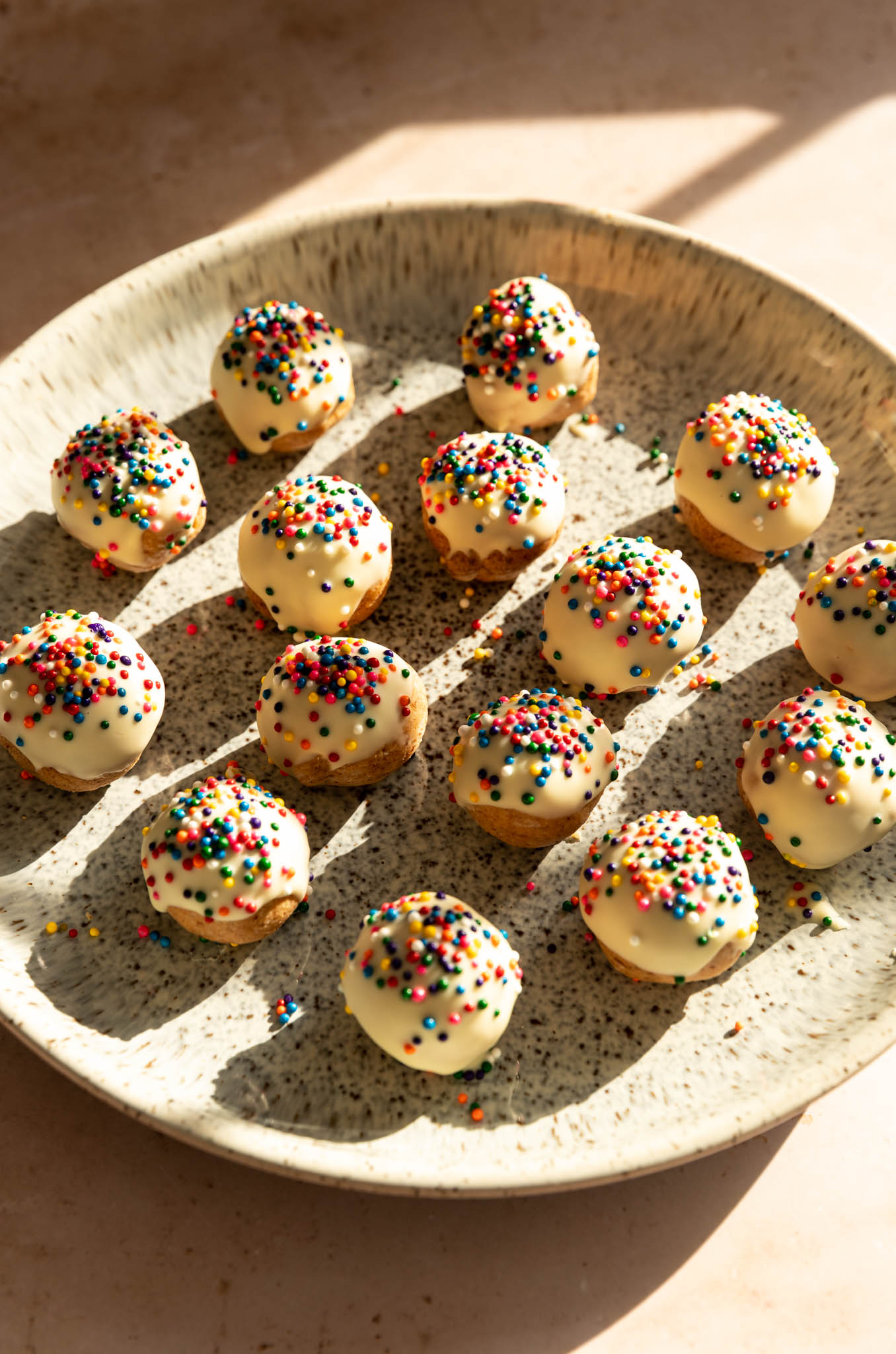 - Tremper chaque boule à moitié dans le chocolat blanc fondu, puis décorer avec des bonbons multicolores.