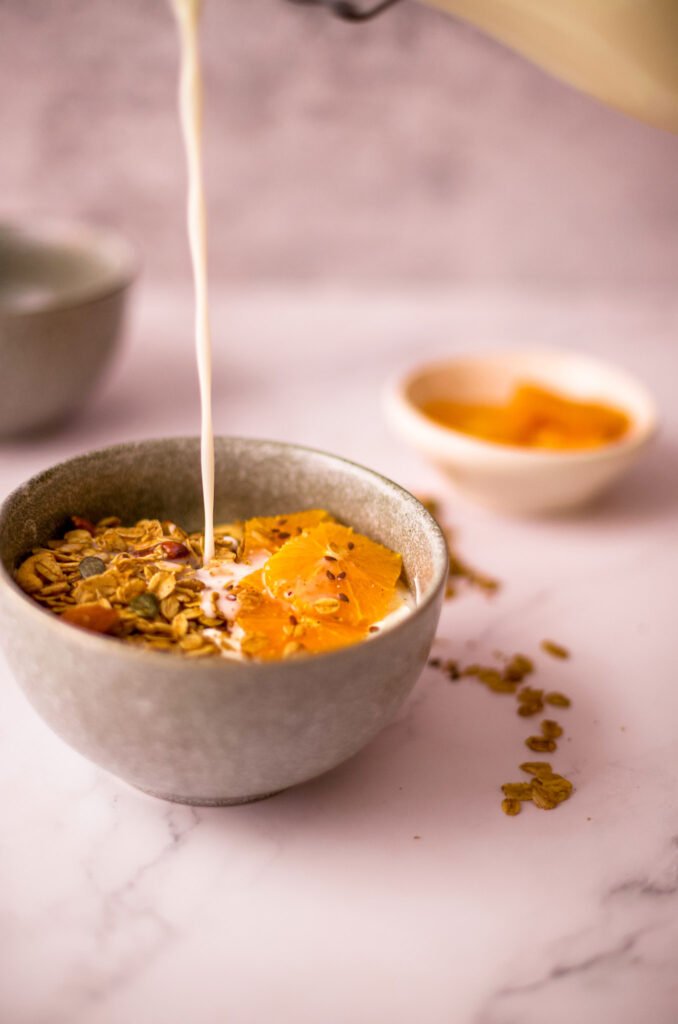 Commencez votre journée du bon pied avec ce granola santé à l’orange, rempli de saveurs. Merci au zeste d’orange, aux noix, à la cannelle et au gingembre!