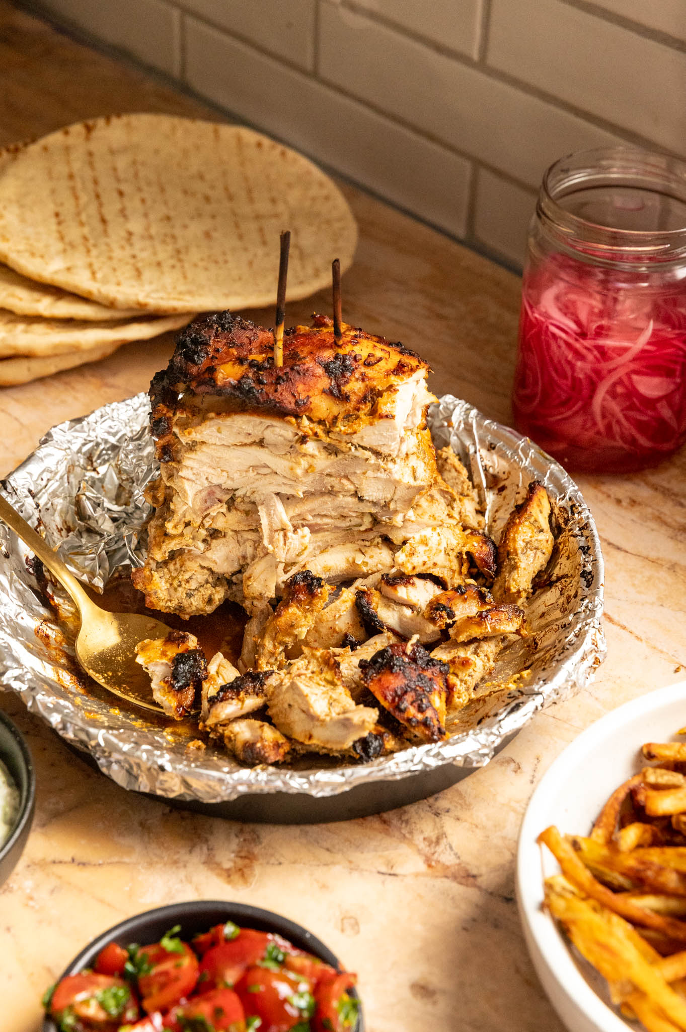 - Monter le gyros. Empiler les hauts de cuisses sur les deux brochettes, en s’assurant que la structure soit aussi stable que possible. Couvrir les extrémités exposées des brochettes avec un morceau de papier d’aluminium pour éviter qu’elles ne brûlent.