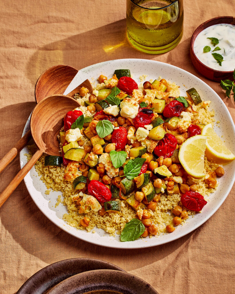 Couscous de pois chiches et légumes grillés, sauce à la menthe