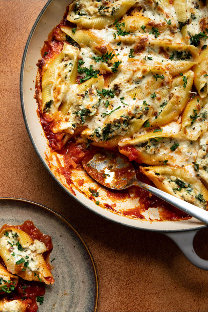 Coquilles farcies à la ricotta, kale et oignons caramélisés