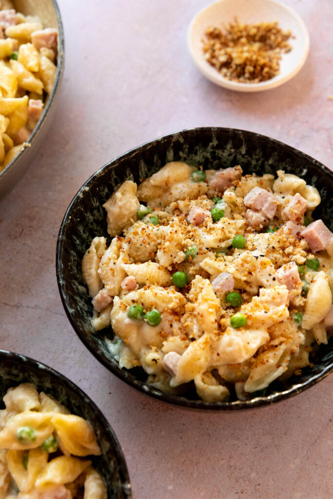 Mac & cheese au chou-fleur, petits pois et jambon