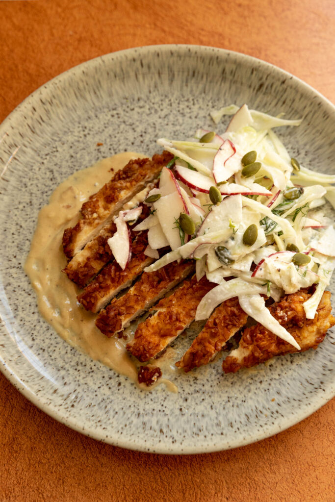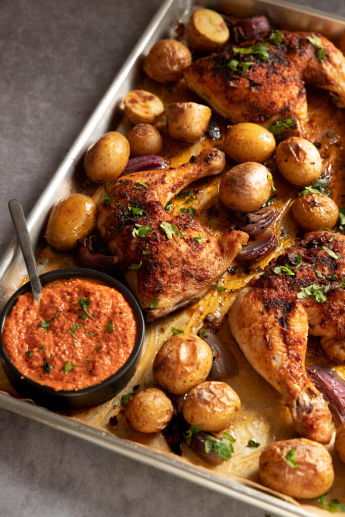 Poulet entier miel moutarde, patates grelots et ail rôti