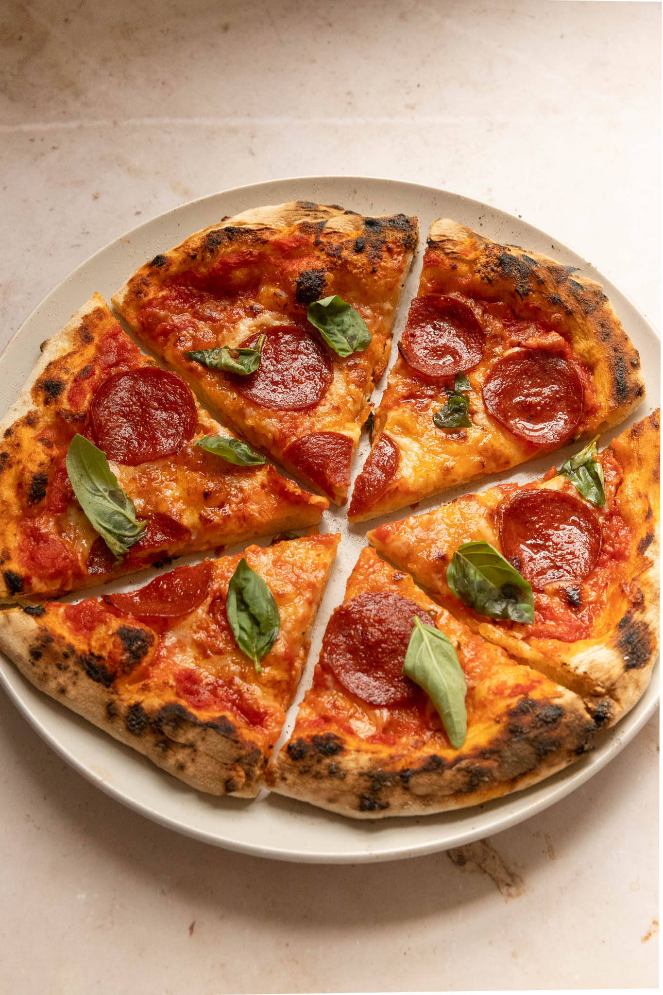 - Cuire la pizza selon la méthode désirée (voir cuisson ci-dessous) puis garnir de feuilles de basilic frais.