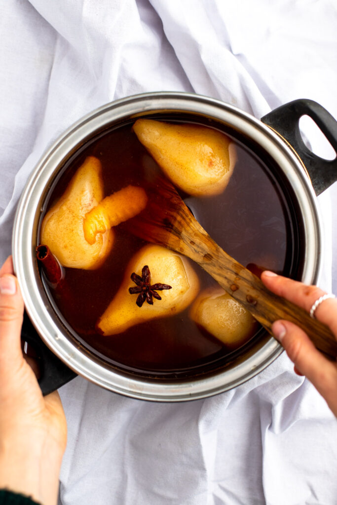 • Dans un petit chaudron, combiner les poires, l’eau, les étoiles anisées, les bâtons de cannelle, le sirop d’érable, la cannelle moulu et la pelure d’une orange. Cuire à feu doux pendant environ 15-20 minutes jusqu’à ce que les poires soient cuites. Retirer les poires du mélange et réserver.