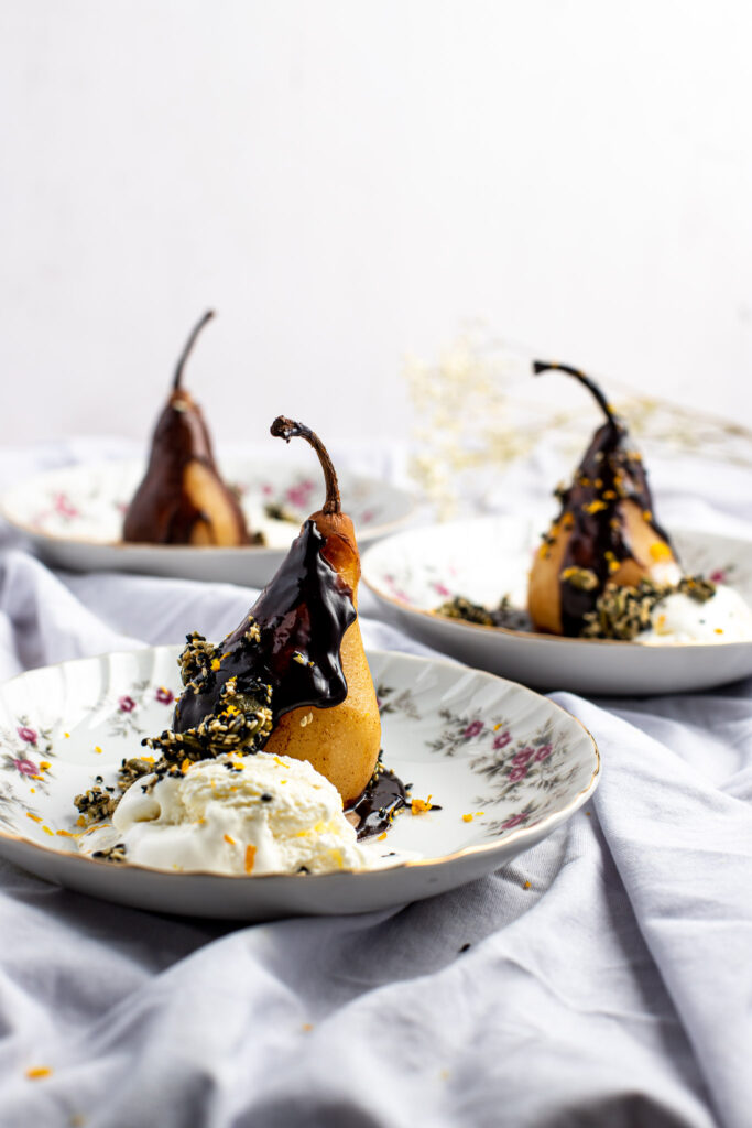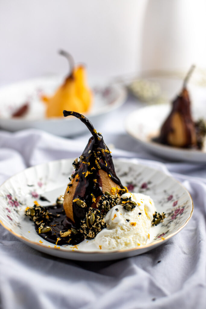 Poires pochées, avec sauce au chocolat et croquant au sésame