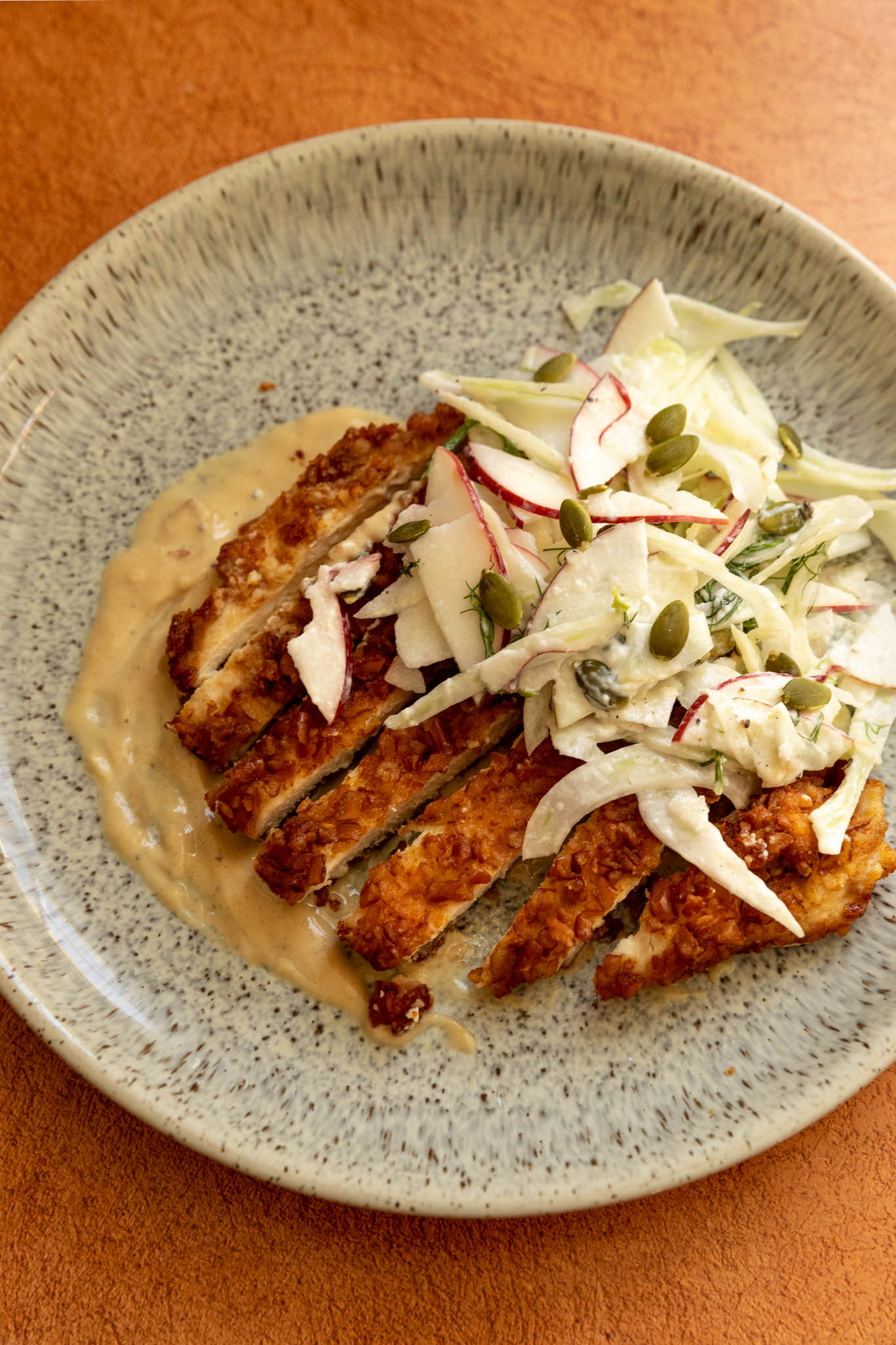 minutesCette recette de poulet en croûte de pretzel est originale et gourmande. On sert le poulet avec une sauce miel et moutarde et on l’accompagne d’une salade de fenouil et pommes. Bon appétit!