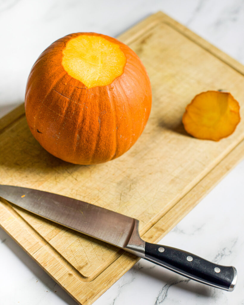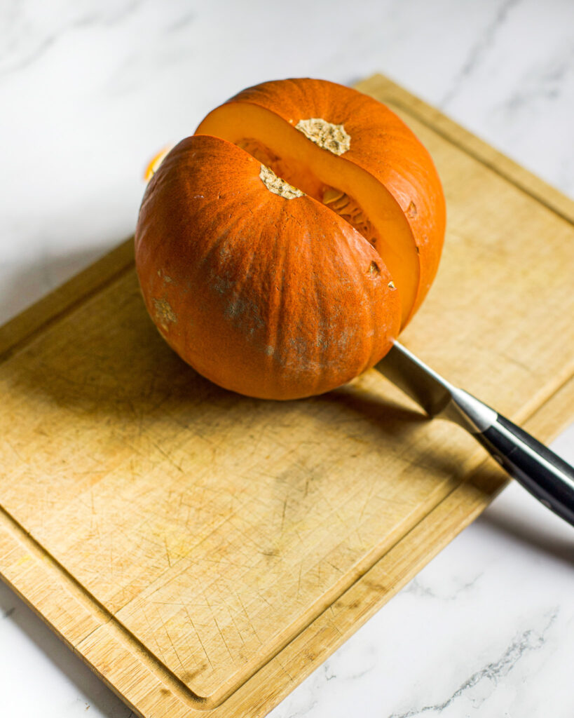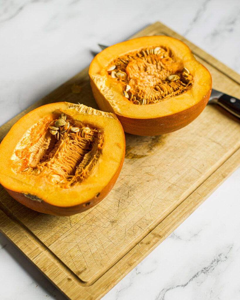 Vous pouvez également cuire la citrouille entière. Simplement suivre les étapes 1 à 3 ci-dessous pour la coupe et retirer les graines. Déposer le côté coupé vers le bas avec de l’huile végétale sur une plaque à cuisson. Cuire à 350 degrés pour environ 45 minutes à 1 heure.