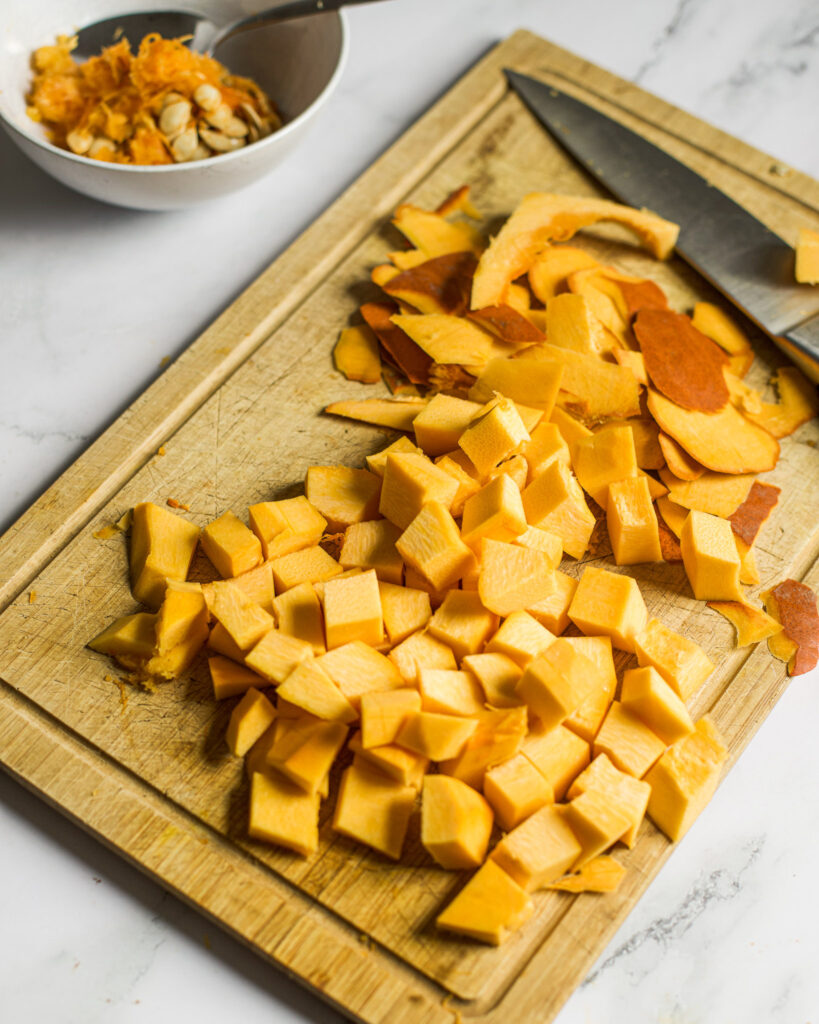 Vous pouvez cuire la citrouille en cubes, voir ci-dessous la technique pour la coupe. Par la suite, placer les cubes de citrouille sur une plaque à cuisson avec de l’huile végétale et cuire au four à 400 degrés pour 30 minutes, en retournant à mi-cuisson.