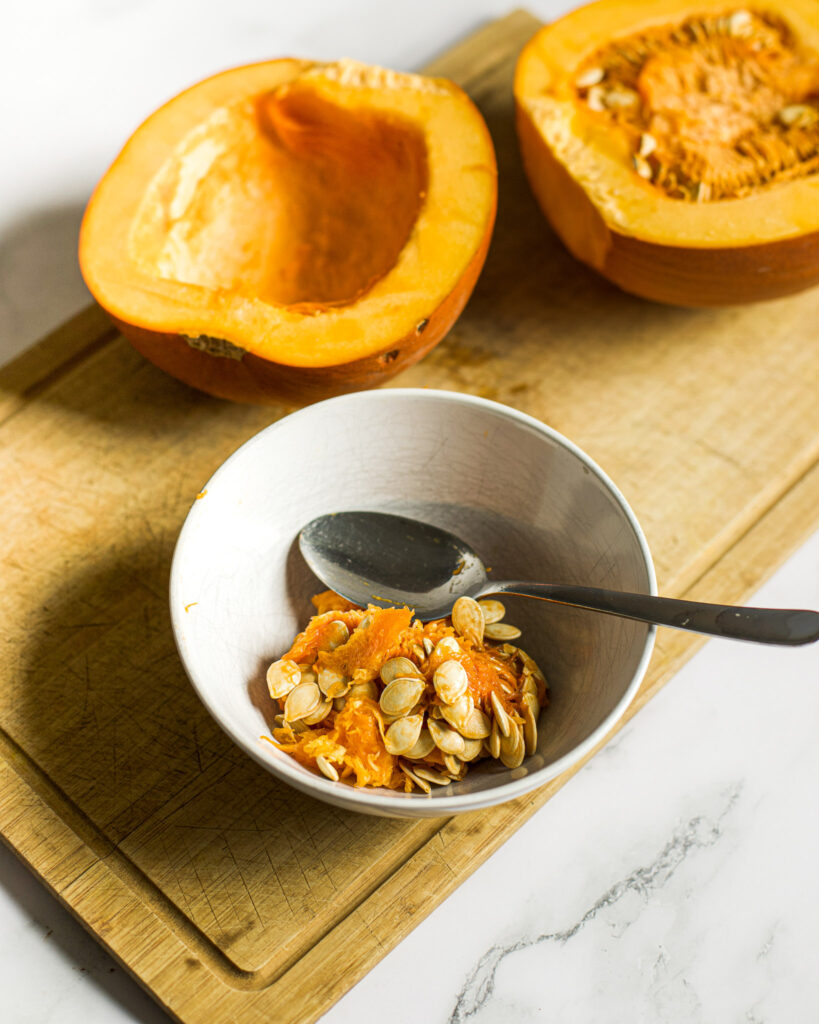 - Retirer les graines de citrouille à l’aide d’une cuillère.