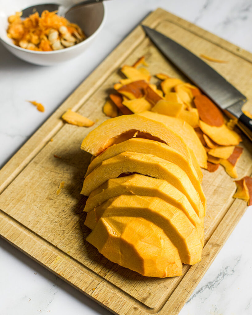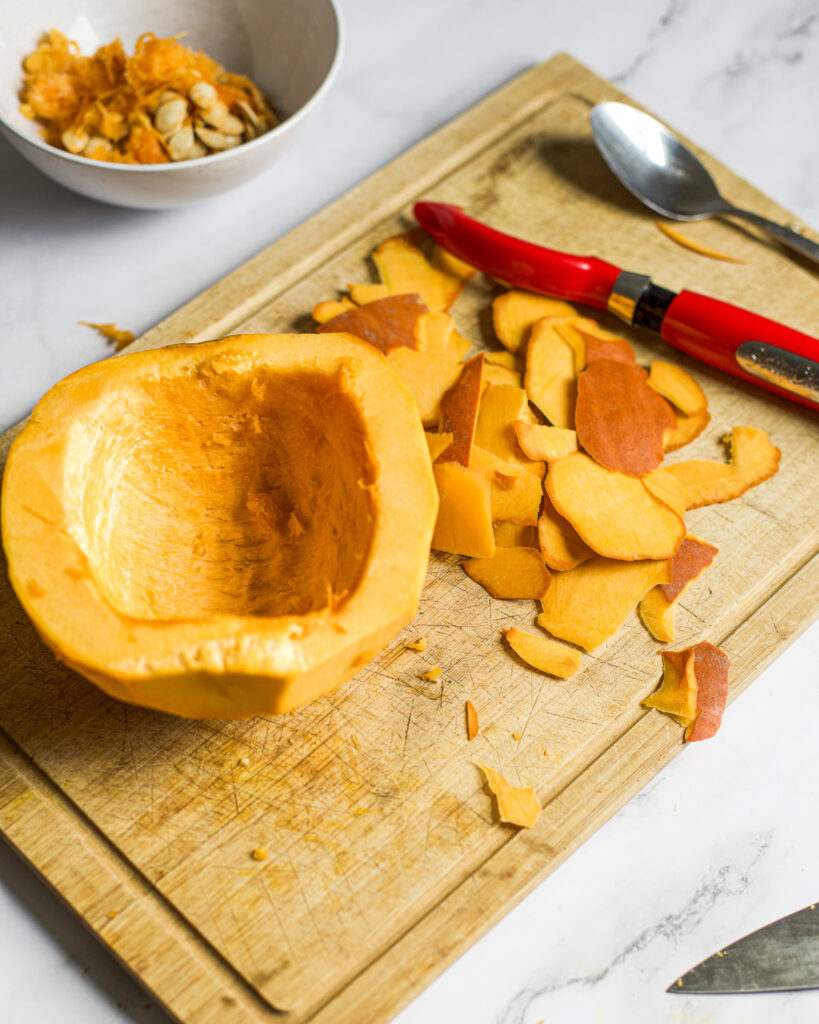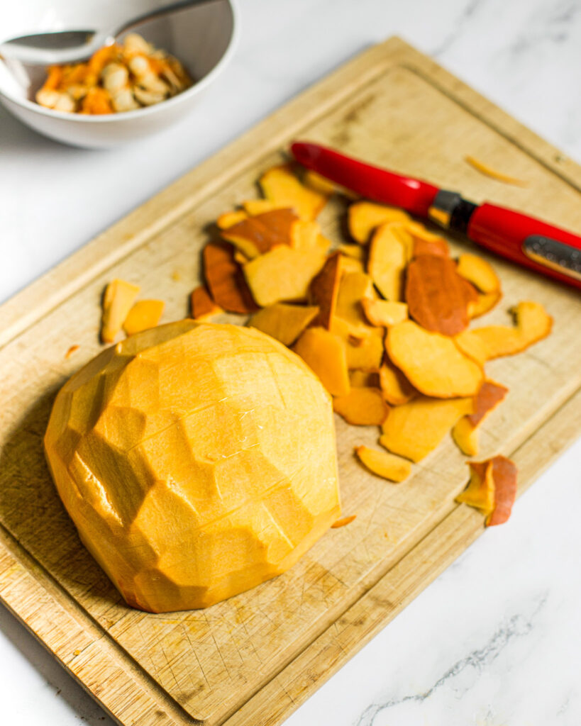 - Éplucher la peau de la citrouille à l’aide d’un économe.