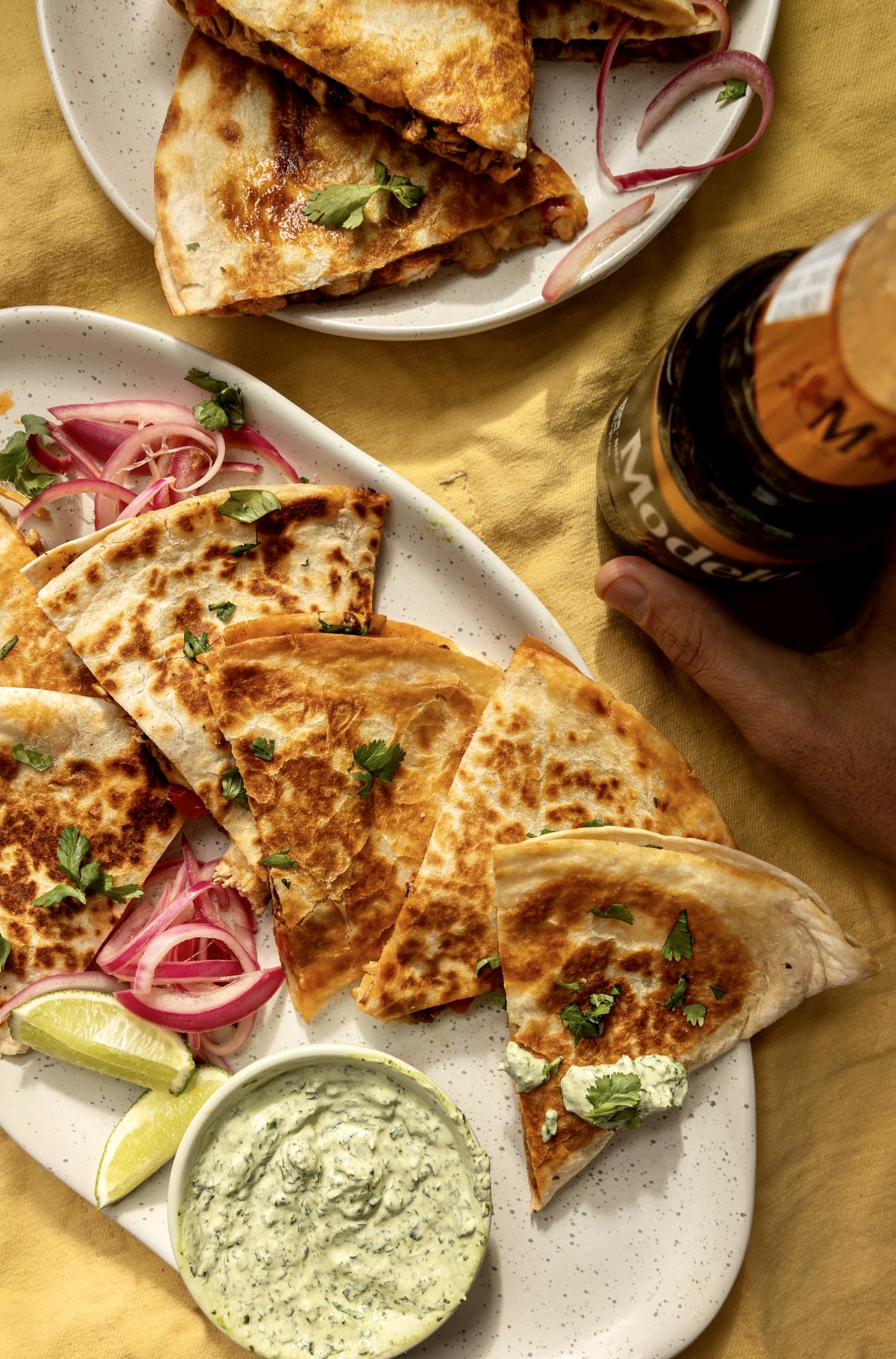 - Assembler les quesadillas. Sur la moitié d’une tortilla, répartir un peu de fromage, ajouter quelques cuillères de garniture, puis terminer avec un peu de fromage. Replier la tortilla et répéter avec le reste des tortillas.