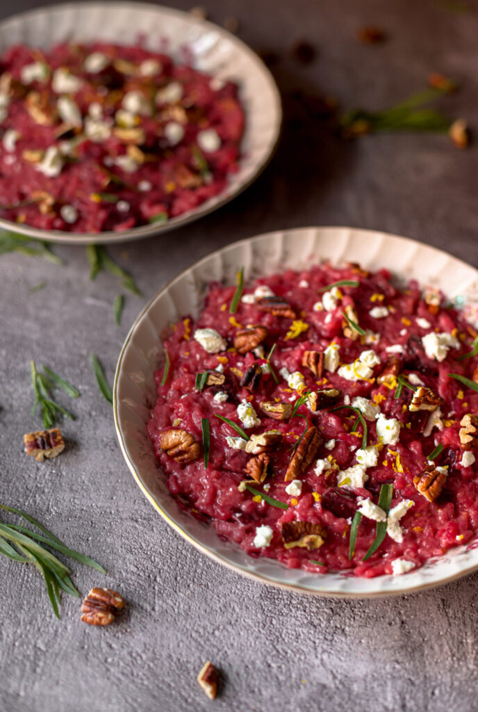Ce risotto aux betteraves et fromage de chèvre est crémeux et original. C’est comme manger une salade de betteraves dans un risotto. On le garni de pacanes grillés, d’estragon et de zeste de citron. Parfait pour recevoir les ami(e)s à la maison ou un souper en amoureux.