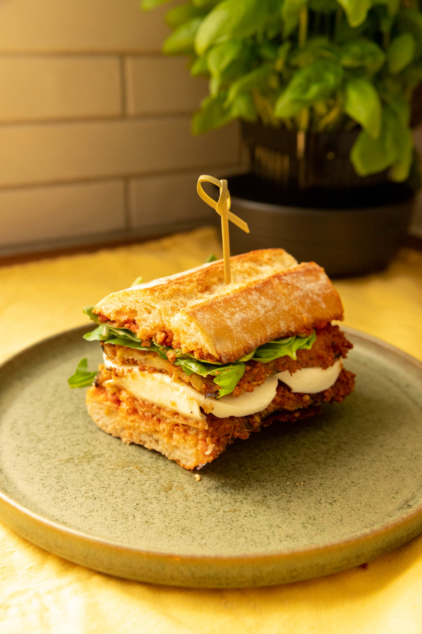 Un sandwich gourmand à l’aubergine parmigiana, garni de mozzarella et de sauce marinara, parfait pour un lunch frais et réconfortant!