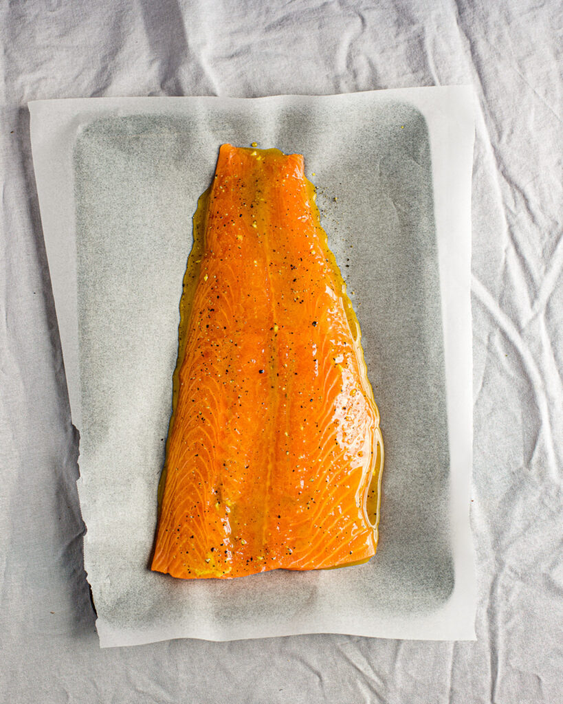 - Retirer un maximum d’eau du saumon. Utiliser un papier essuie-tout. Si le poisson est congelé, assurez-vous qu’il est complètement décongelé.