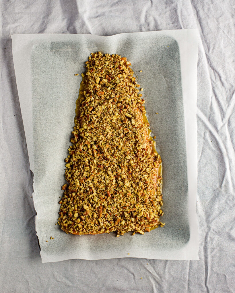 - Déposer les pacanes sur le saumon et bien répartir pour créer une croûte uniforme.